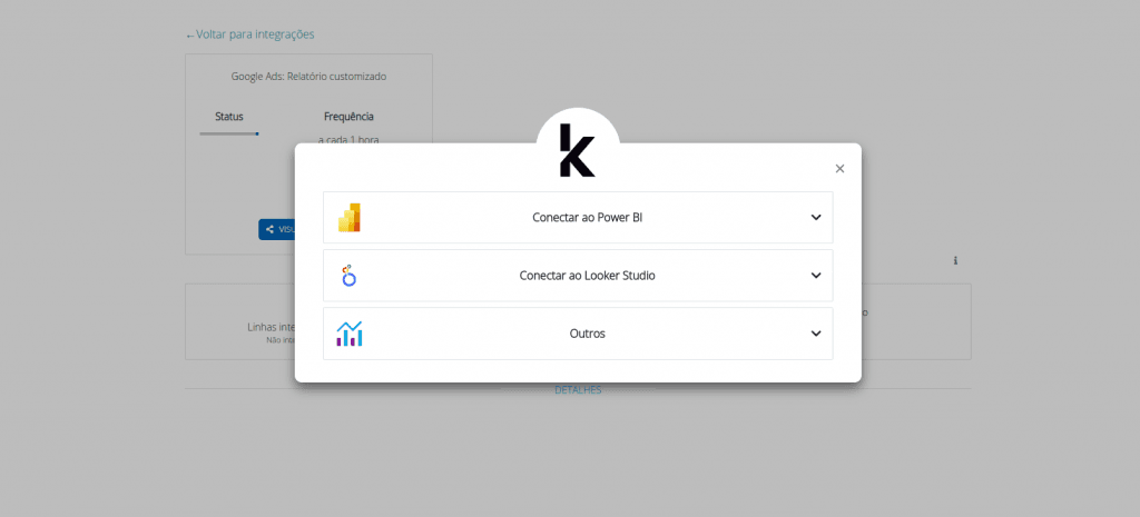 - Depois de salvar sua integração e ela for executada, você verá as opções da imagem na sua tela. Selecione a opção “Conectar ao Power BI”.