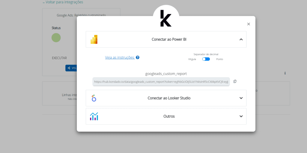 - Agora, você terá acesso a um link para inserir no Power BI e visualizar seus dados lá. Para saber onde inserir o link no Power BI, clique em “Ver as instruções”.