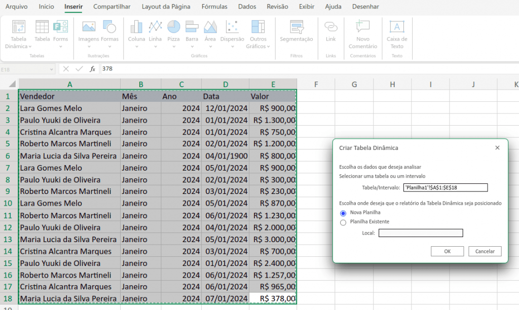 - O Excel sugere automaticamente o intervalo de dados. Confira se está correto e decida onde deseja inserir a tabela dinâmica: em uma nova planilha ou na existente.