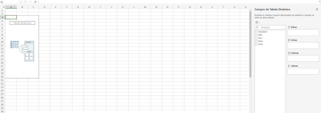 Outra novidade é a área cinza no lado direito da tela “Campos de Tabela Dinâmica”, com as categorias da nossa tabela do lado esquerdo e as áreas Filtros, Linhas, Colunas e Valores no lado contrário.