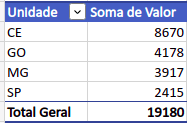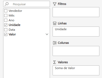 Para respondermos a pergunta “Qual foi o faturamento total por unidade?”, arrastaremos o campo “Unidade” na área “Linhas” e o campo “Valor” para a área “Valores”, como mostrado na imagem abaixo.