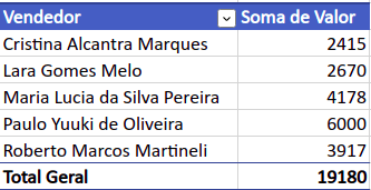 Seguindo para a segunda pergunta, vamos arrastar o campo “Vendedor” na área “Linhas” e o campo “Valor” em “Valores”, assim gerando o gráfico abaixo.