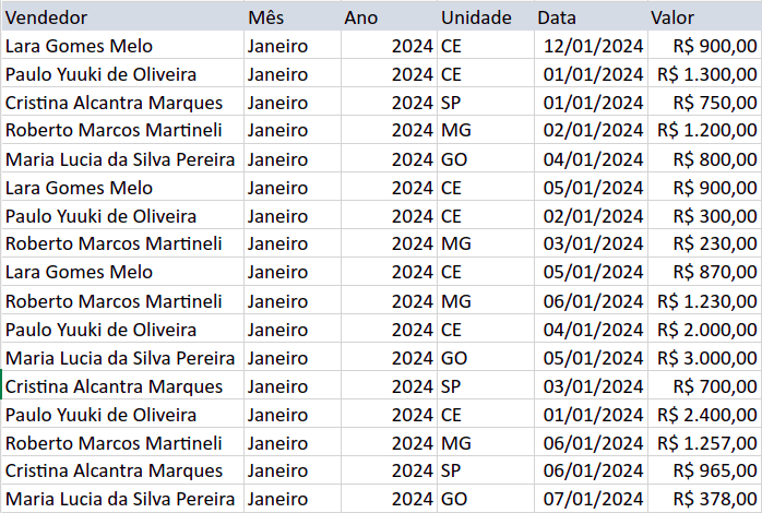 Abaixo temos uma tabela referente às vendas da primeira semana do mês de janeiro de 2024 da rede da marca nos seguintes lugares: Ceará, Goiás, Minas Gerais e São Paulo.