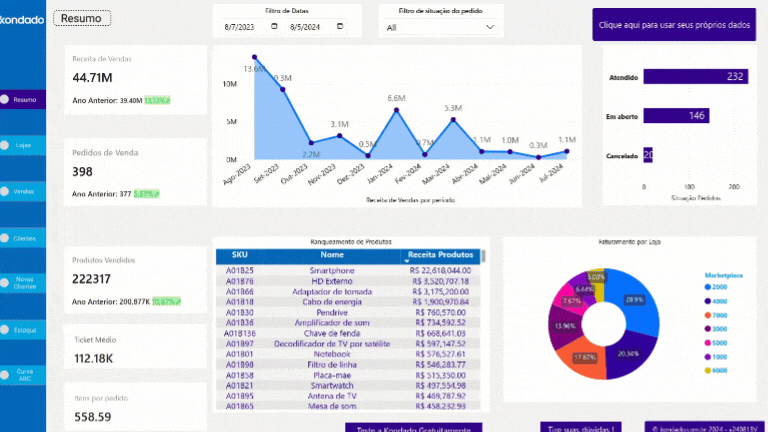 Com ele, você pode monitorar suas vendas por loja, segmentar clientes, ajustar filtros e visualizações conforme suas necessidades, além de acompanhar o desempenho dos produtos e muito mais!
