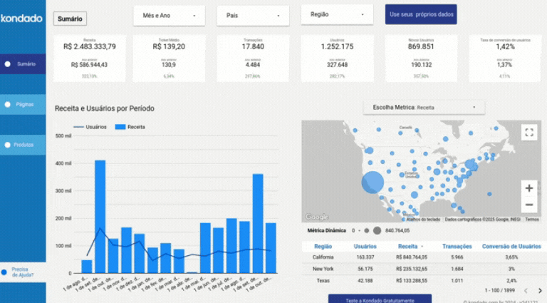 Se você utiliza o Google Analytics 4 (GA4), sabe que transformar dados brutos em insights estratégicos pode ser um desafio. Para facilitar sua análise, a Kondado oferece um dashboard gratuito exclusivo para GA4 no Looker Studio, projetado para fornecer uma visão completa e organizada das principais métricas do seu negócio.