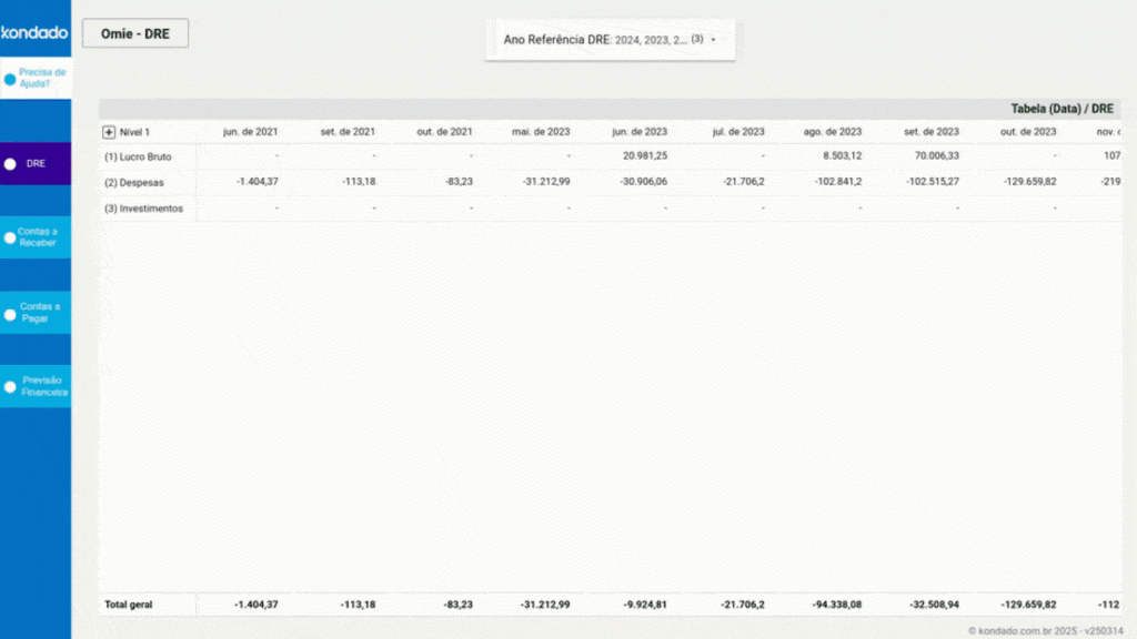Traz em uma tabela dinâmica uma visão detalhada da Demonstração do Resultado do Exercício (DRE) com detalhes sobre o lucro bruto, despesas e investimentos. Ela organiza os valores de forma mensal, tornando possível as comparações dos períodos selecionados.