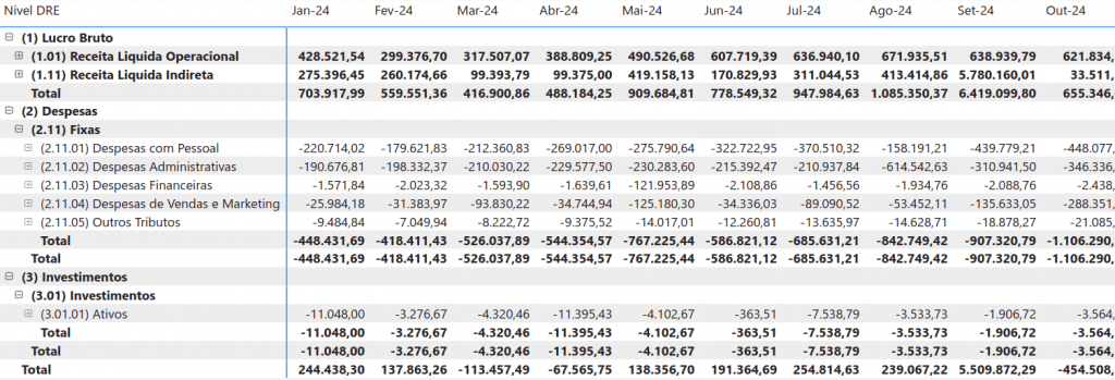 Mostra a evolução de lucro, despesas e investimentos ao longo do tempo.