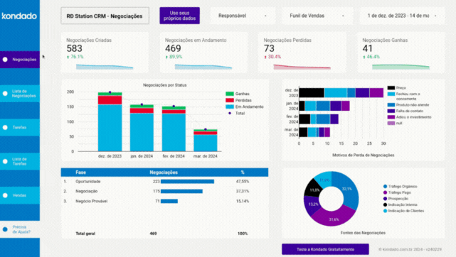 - Pela Kondado: A integração da Kondado com o RD Station CRM permite criar dashboards personalizados com gráficos interativos sem necessidade de programação e automatizar seus relatórios em ferramentas de planilhas como Google Sheets e Excel, plataformas de BI como Power BI e Looker Studio e também bancos de dados como Microsoft SQL Server e o Redshift.