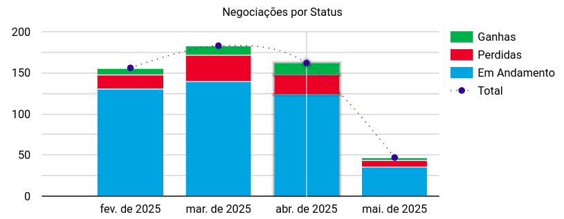 Permite visualizar o estágio em que cada negociação se encontra (em andamento, ganha e perdida), ajudando a entender o fluxo do funil de vendas.