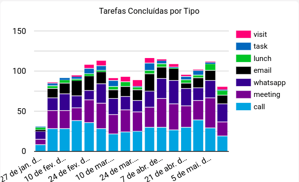 Lista a quantidade de tarefas finalizadas, segmentadas por tipo (ligações, reuniões, email, etc).