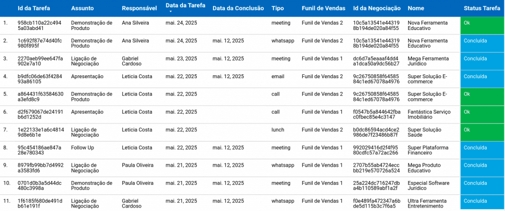 Detalha todas as tarefas vinculadas às negociações com informações como funil de vendas, status e responsável, facilitando o acompanhamento das atividades pendentes e concluídas.
