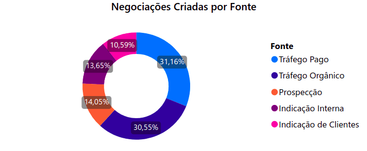 Indica o total das negociações do período definido e suas principais origens ( tráfego orgânico, tráfego pago, prospecção, entre outros), auxiliando na análise da eficácia dos canais de prospecção.