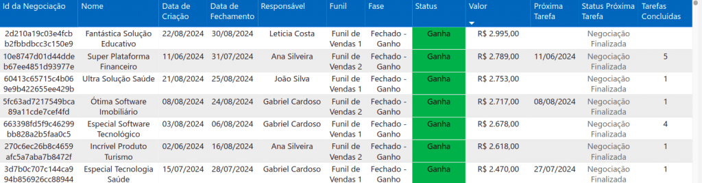 Apresenta um detalhamento das negociações, incluindo informações como nome, data de criação, responsável, valor, e status.