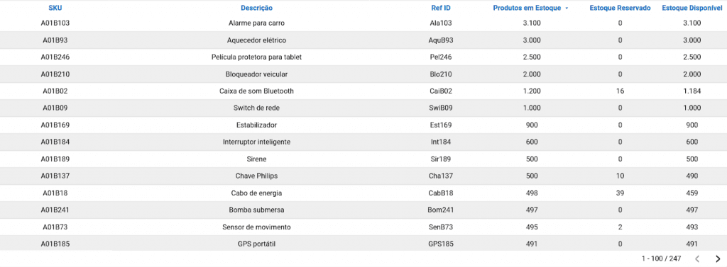 Detalha informações sobre a quantidade disponível de cada produto no estoque atual, ajudando no planejamento de reposições.