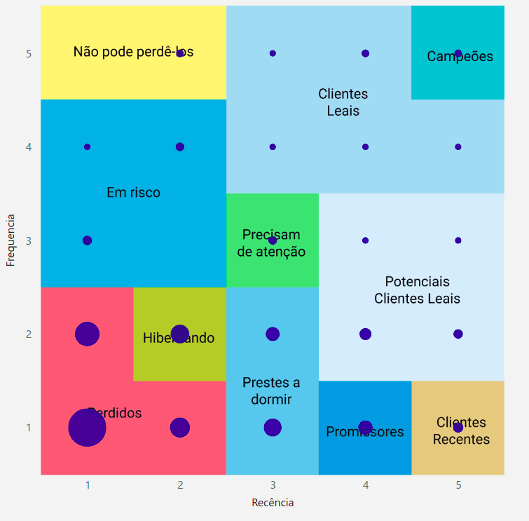 Cada um possui uma pontuação que varia entre 1 e 5, conforme quantidade de vezes que realizou compras e dias desde a última compra.