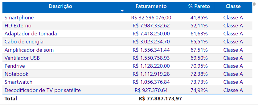 Mostra uma classificação dos produtos usando a curva ABC, separando eles por produto ou categoria e mostrando a porcentagem do faturamento em vendas de cada item,ajudando a identificar os itens mais estratégicos para o negócio. Também é mostrada a quantidade de itens vendidos.