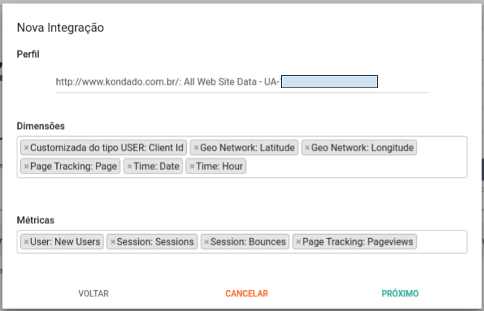 Siga o restante dos passos para finalizar a integração e voilá! Você terá uma integração granularizada do Google Analytics onde poderá ver para cada Client ID, Latitude, Longitude, página, data e hora as seguintes métricas: