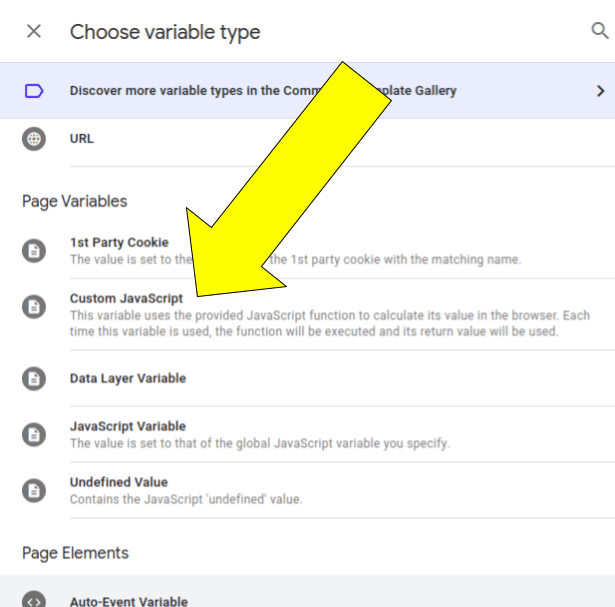9) No menu de seleção de tipo de variável, selecione "Custom Javascript"