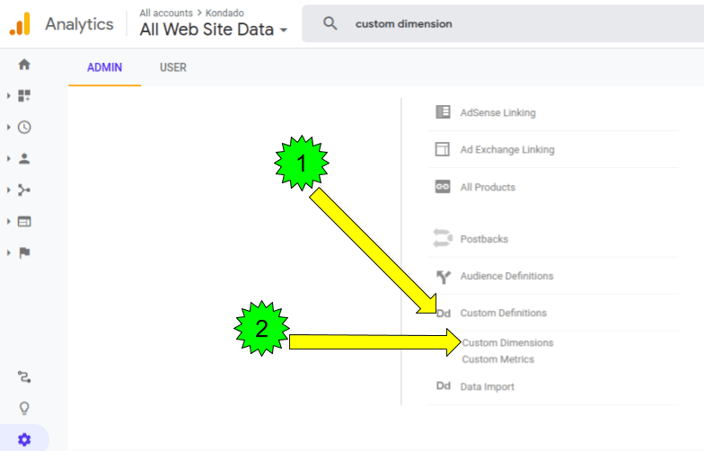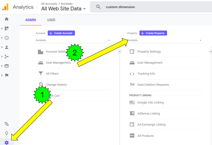 Para poder interar o Client ID via plataforma da Kondado, vamos primeiro criar a dimensão customizada no GA. Siga os passos abaixo: