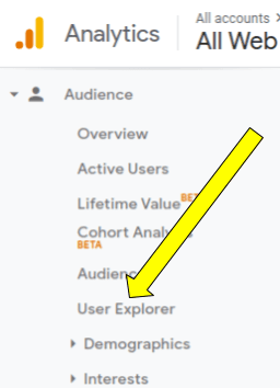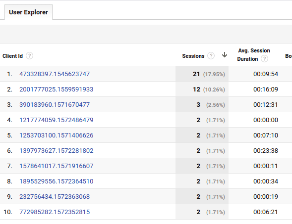 O relatório de User Explorer, mostra dados granulares de várias métricas usando o Client ID:
