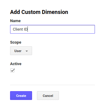 4) Dê um nome para a sua nova dimensão. Por exemplo, "Client ID", selecione "User" como Scope e clique em "Create"