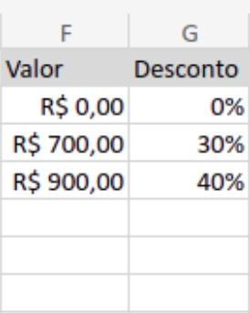 Foi criada uma tabela com as faixas de valores e seus descontos.