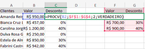 Agora, usaremos a função PROCV. Veja que, neste caso, a “matriz_tabela” é a segunda tabela, com os valores e descontos do salão.