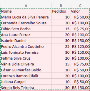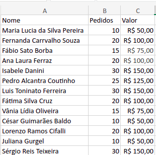 Temos como exemplo a seguinte situação: uma doceria que possui uma tabela com nome dos seus clientes, quantidade de pedidos e o valor recebido pelos produtos, conforme imagem abaixo, e deseja encontrar o valor da cliente Isabele Danini.