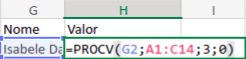 Aqui, “Isabele Danini” é o valor procurado, “A1:C14” é o que foi selecionado e onde o Excel irá procurar, “3” é a coluna do valor das vendas, e 0 (“FALSO”) especifica que queremos uma correspondência exata.