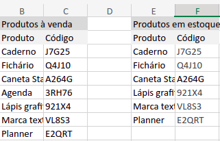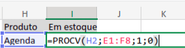 Agora, vamos verificar se a agenda está em estoque. Para isso, usamos a função PROCV selecionando a tabela referente aos produtos em estoque.