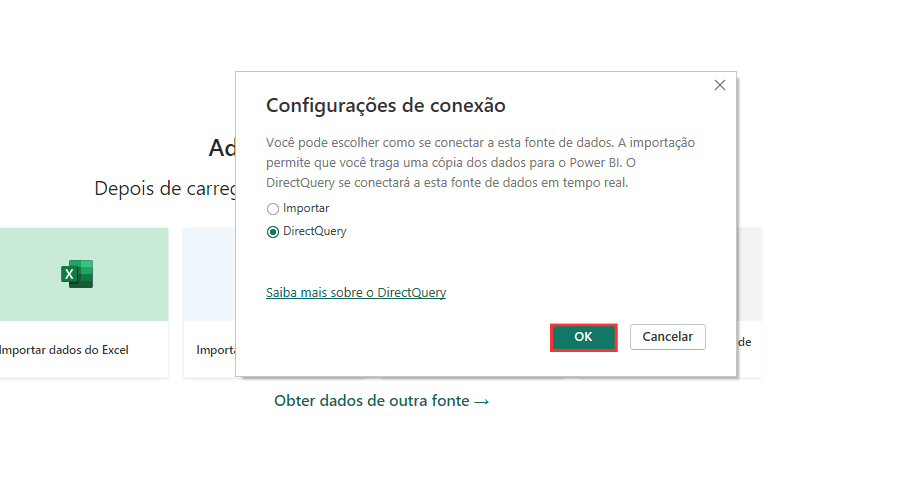 - Após esta etapa, você será apresentado às configurações de conexão. Selecione a opção “DirectQuery” para que os dados sejam atualizados no Power BI à medida que forem atualizados no seu banco Redshift.