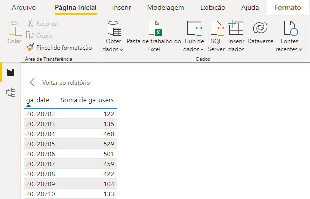 Dessa forma a visualização dos dados do PowerBI será sincronizada a frequência de atualização da integração entre o GA ao BigQuery.