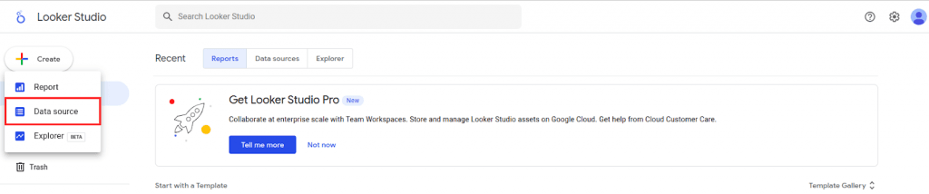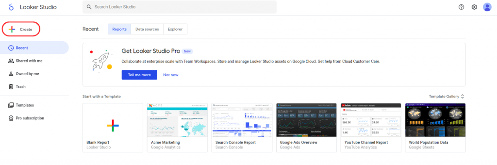 - Acesse o Look Studio e faça login na sua conta do Looker Studio e clique em “Create”.
