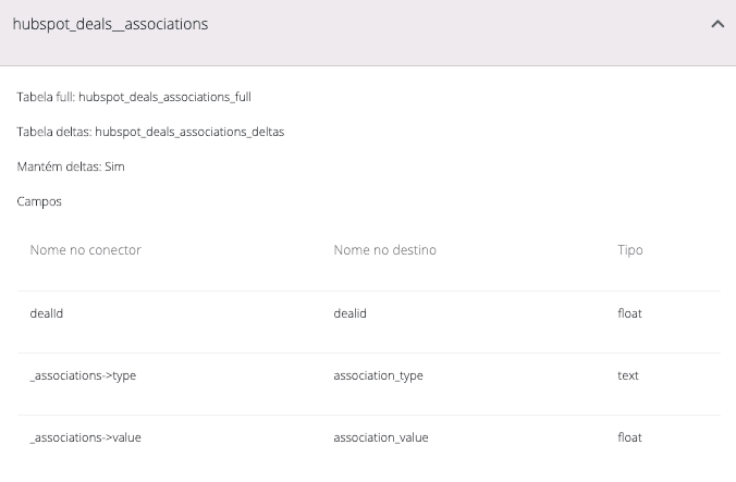 Caso você deseje criar um modelo listando todos os seus deals e trazendo informações dos contatos associados à cada deal, você precisará fazer uma junção destes dois objetos. Para isso, o Hubspot conta com uma tabela de associações (exemplos: deals_associations, ticket_associations). Essa tabela faz parte das coleções dos objetos "Deals" e "Tickets", portanto se você já criou a sua integração deles pela Kondado, elas estarão no seu banco de dados.
