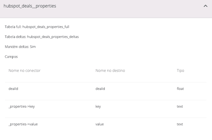 Ao criar as integrações de deals, tickets ou contatos, você encontrará no seu banco também as tabelas de "properties". Essas tabelas têm a seguinte estrutura (no exemplo abaixo estamos usando a tabela de propriedades dos deals):