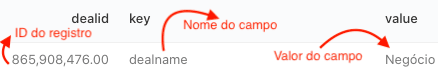 Essa tabela é formada por três colunas, no exemplo abaixo usamos a tabela de deals, porém o mesmo aplica-se para Tickets: