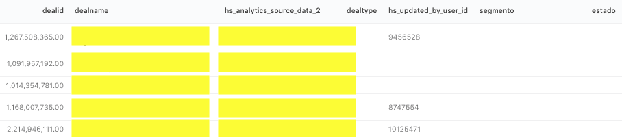 Como já explicamos no início desse artigo, as propriedades dos objetos do Hubspot são levadas em linhas ao seu banco de dados.