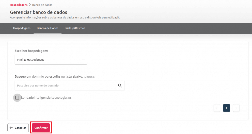 5. Selecione a hospedagem e o domínio no qual o seu banco de dados ficará hospedado: