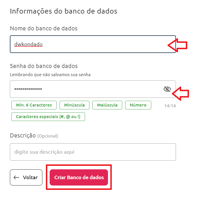 7. Na mesma tela, um pouco abaixo, escolha o nome do seu banco de dados (até 14 caracteres, de preferência sem caracteres especiais ou letras maiúsculas) e defina uma senha para ele atendendo a todos os critérios listados. Então, clique em "Criar Banco de dados":