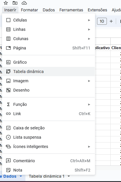 Em seguida, basta clicar em 'Inserir' e, no menu que se abre, selecionar 'Tabela Dinâmica'.