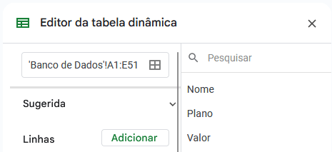 Para isso, basta acessar o editor de tabela dinâmica, selecionar 'Plano' em 'Linhas', 'Valor' em 'Valores' e escolher a opção 'SUM' em 'Resumir por'.