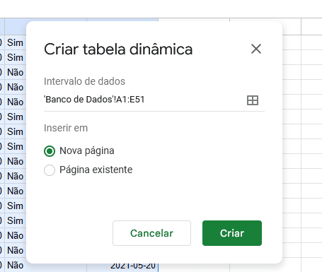 Ao selecionar 'Tabela Dinâmica', será exibida a seguinte página: