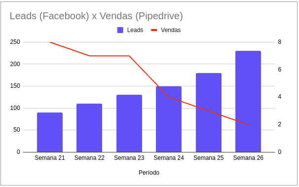Esse tipo de gráfico, que chamamos de emparelhado, não está relacionando as duas informações. Isso significa que as vendas de uma dada semana, não são necessariamente frutos dos leads dessa mesma semana.