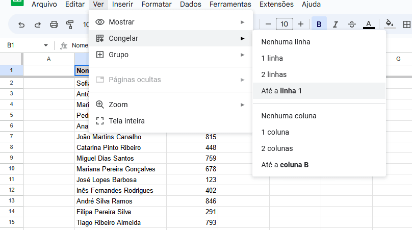 Você pode selecionar a linha que você deseja congelar e ela estará como opção Até a linha X. Em nosso exemplo Até a Linha 1.