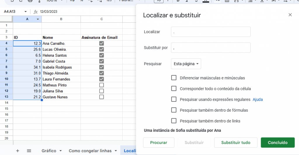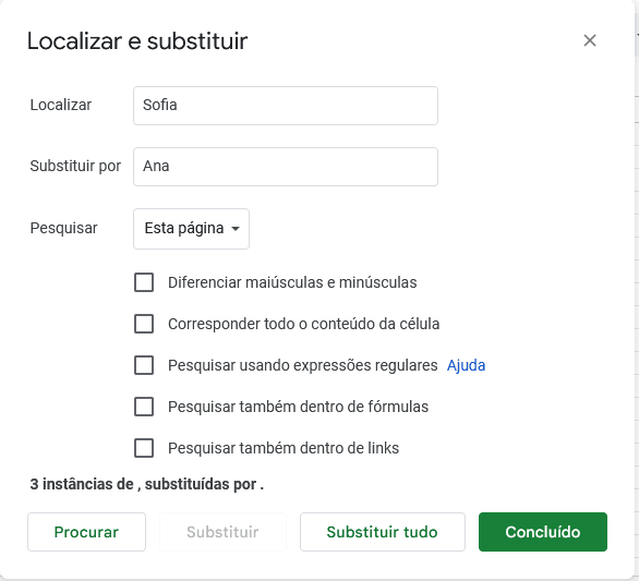 Vamos procurar pelo nome 'Sofia' e substituir pelo nome 'Ana' em toda a nossa página. Para isso, basta informar qual o nome a ser substituído, qual o nome novo e selecionar Substituir tudo.