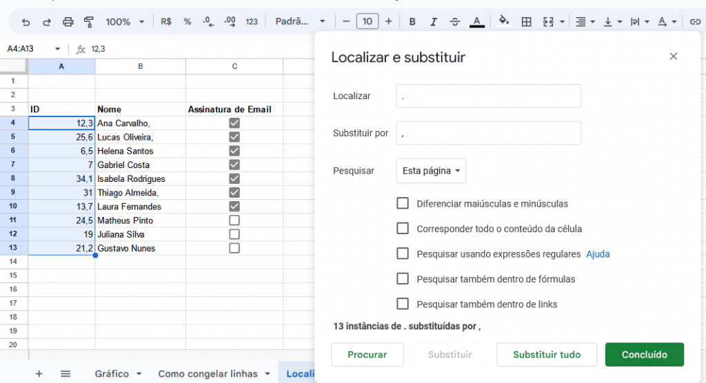 No caso, temos aqui alguns números com pontos e iremos fazer a troca por vírgulas.