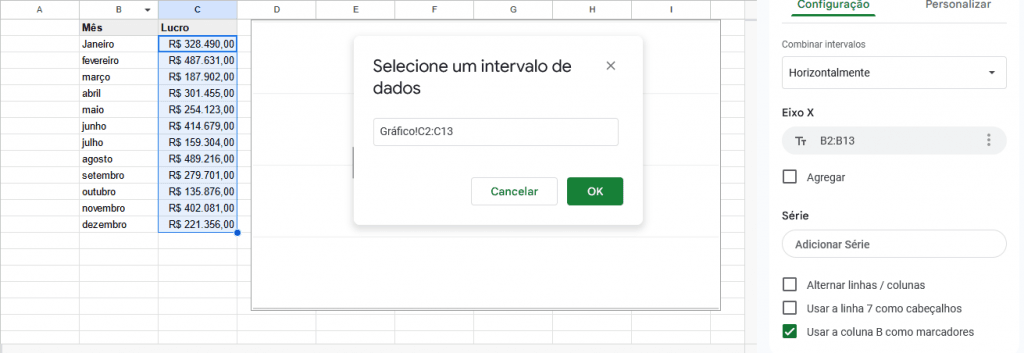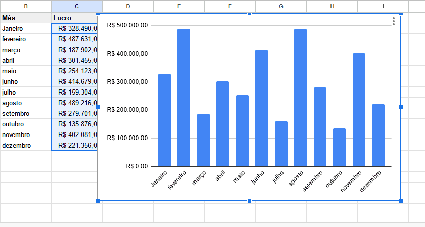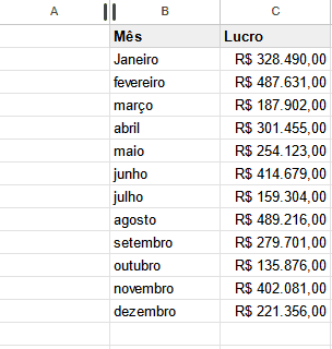 Temos, como exemplo, uma tabela simples, mostrando os meses do ano e o lucro em cada um deles.