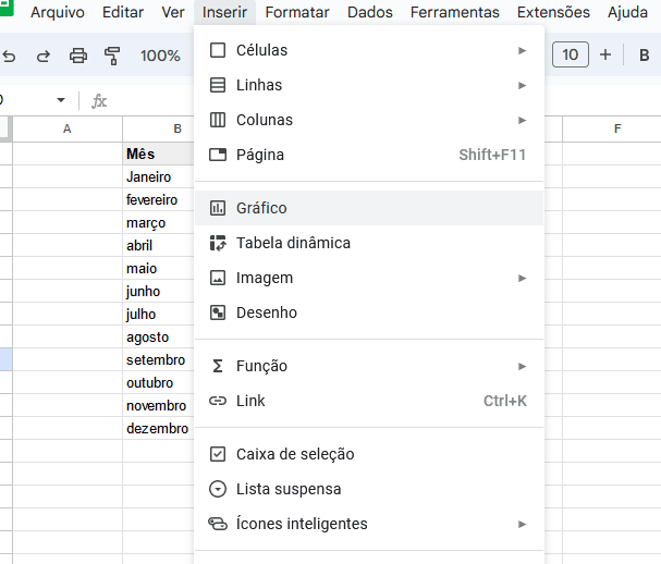 Para fazer um gráfico no Google Sheets é muito simples, basta clicar em Inserir, e em Gráfico.
