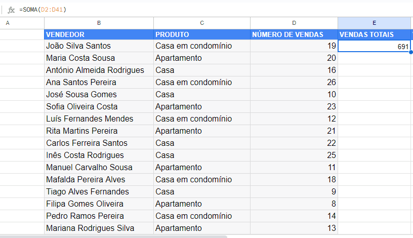 Nesse caso, nosso intervalo é o de Produtos, o critério é Casa, que escrevemos entre parênteses, e o intervalo soma é NÚMERO DE VENDAS, onde haverá a soma do número de vendas utilizando nosso critério, no caso, Casa.