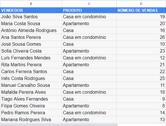 Temos aqui uma tabela de uma imobiliária hipotética com nome dos corretores , o número de vendas e o produto que vendem.